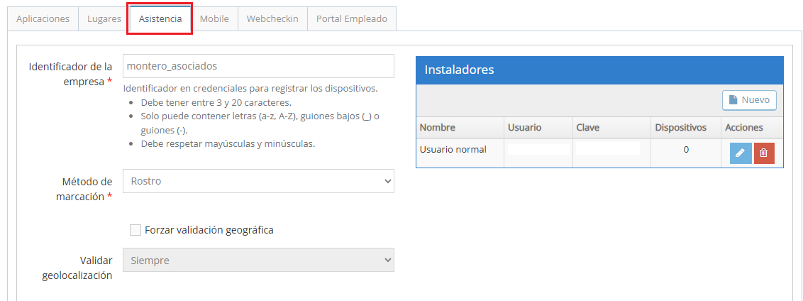 En esta subsección podrá definir el Identificador de la empresa, crear usuarios instaladores para Inngresa Asistencia 3 y configurar el método de marcación por defecto, así como la validación por geolocalización.