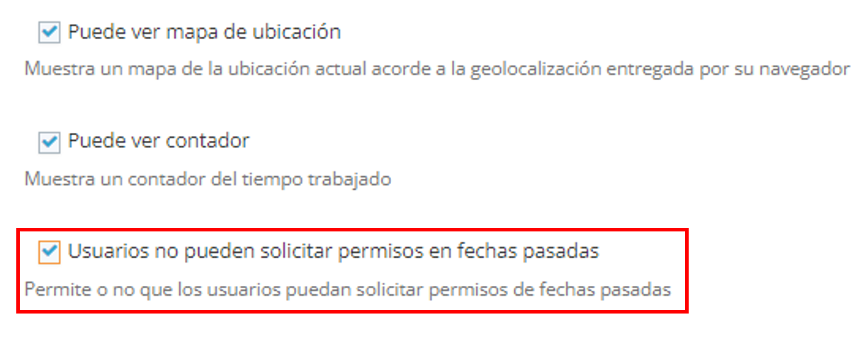 Al habilitar está opción, podrá limitar que los colaboradores no soliciten permisos en fechas pasadas, es decir, todos los permisos a solicitar por parte de los empleados deberán ser desde la fecha actual en adelante (hacia el futuro).