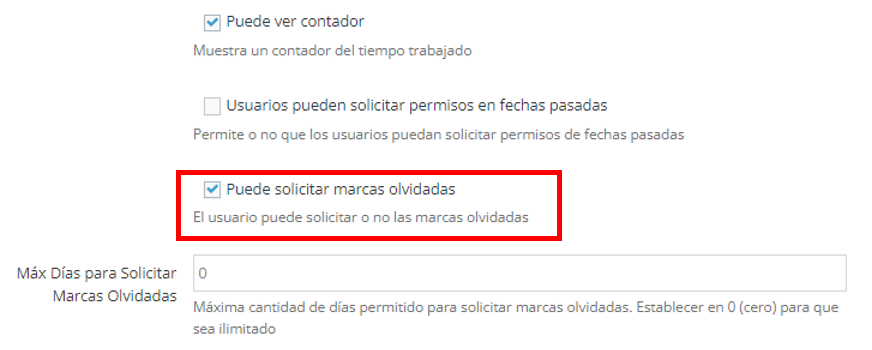 En este campo podrá establecer el plazo máximo que tendrá el empleado para solicitar las marcas olvidadas. Si desea que el plazo sea ilimitado, defina el parámetro con el número cero (0).