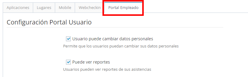 En esta subsección podrá configurar las opciones que el empleado puede ver desde su portal. Para acceder a esta subsección debe ir a la pestaña "Portal Empleado" que se encuentra en la parte superior de la pantalla: