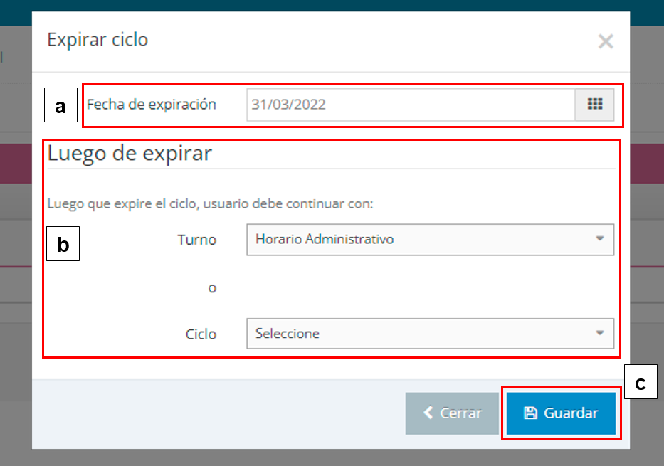 - Luego de expirar: Seleccione el nuevo turno o ciclo que será asignado al colaborador. Este cambio estará vigente al día siguiente de la fecha de expiración.