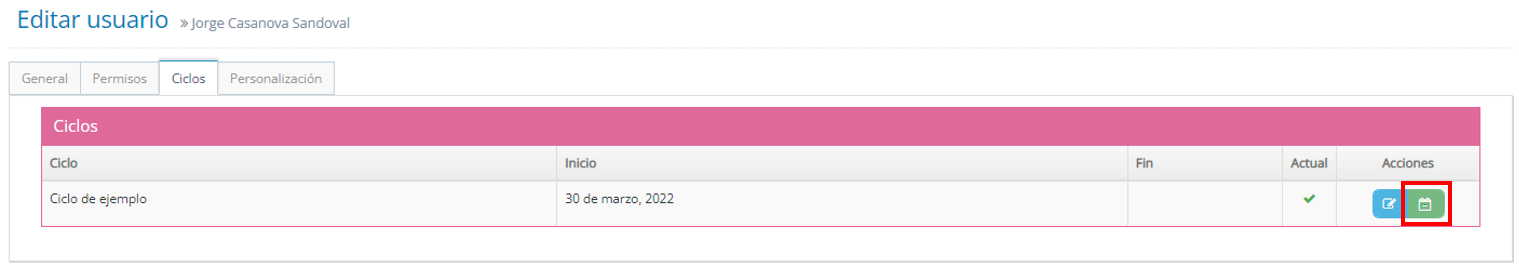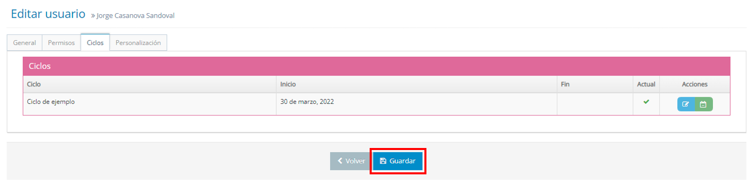 Una vez hecho los cambios en la pestaña de Ciclos desde la sección de Usuarios, haga click en el botón "Guardar" que se encuentra en la parte inferior para confirmar la acción.