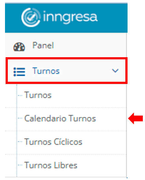 - Ubicar el menú que se encuentra en el lado izquierdo, haga click en la opción de "Turnos" y luego a "Calendario turnos".