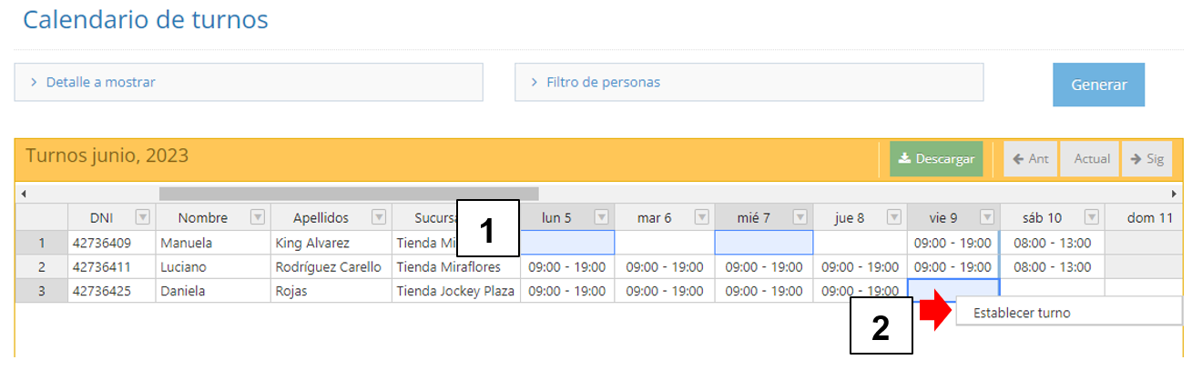 2. Una vez seleccionado el rango que desea, haga click en el lado derecho del mouse y luego a "establecer turno".