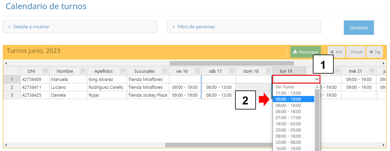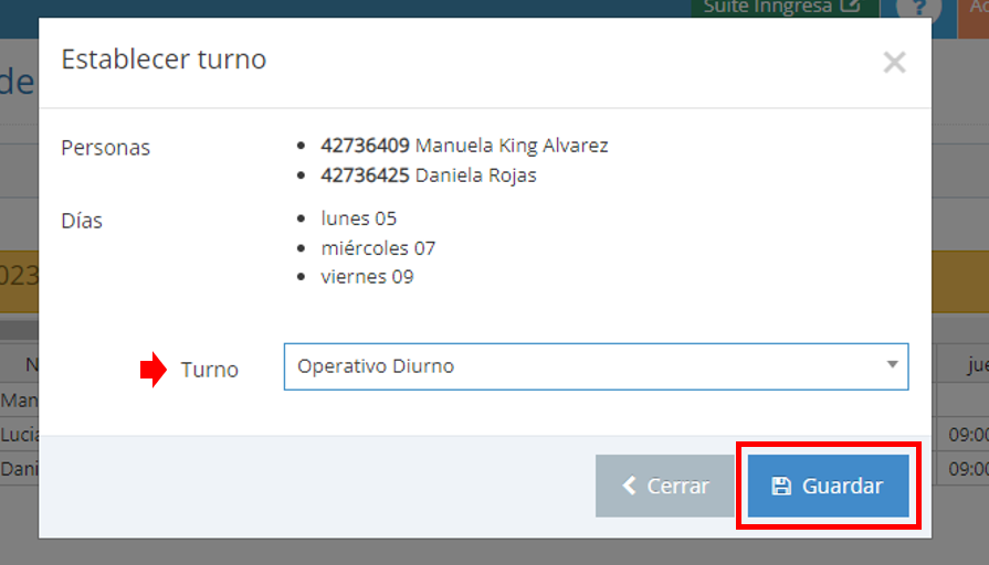 3. Le aparecerá la siguiente ventana modal, la misma contiene la información de las personas y rangos seleccionados; escoja el turno y luego haga click en el botón "Guardar".