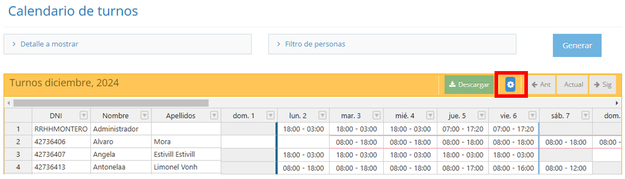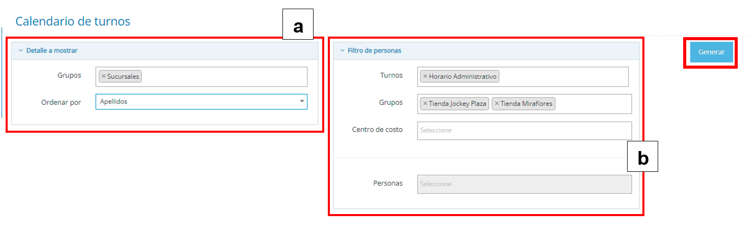 - Filtros de personas: en esta opción podrá seleccionar entre los turnos, grupos o valores y el centro de costo disponible.