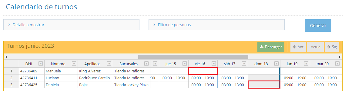 - Casillas blancas: aparecen en el calendario cuando no hay un turno asignado, por consecuencia, el sistema no calculará los indicadores de asistencia correspondientes ya que no existe un marco horario para realizar la comparación.