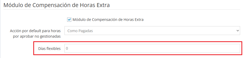 Podrá activar el módulo de compensación de horas extras. Una vez activado podrá definir cual será la acción por defecto cuando las horas no son gestionadas al terminar el mes, para esto tiene dos (2) opciones: declararlas "Como pagadas" o "Como compensadas".