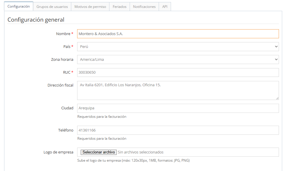 En esta sección podrá visualizar información general de la empresa tal como nombre, RUC, entre otros; asimismo podrá realizar los ajustes necesarios para el cálculo de asistencias, definición de la hora extra y demás funcionalidades que ofrece. También, de ser necesario, podrá activar los diferentes módulos disponibles u otros turnos más complejos.
