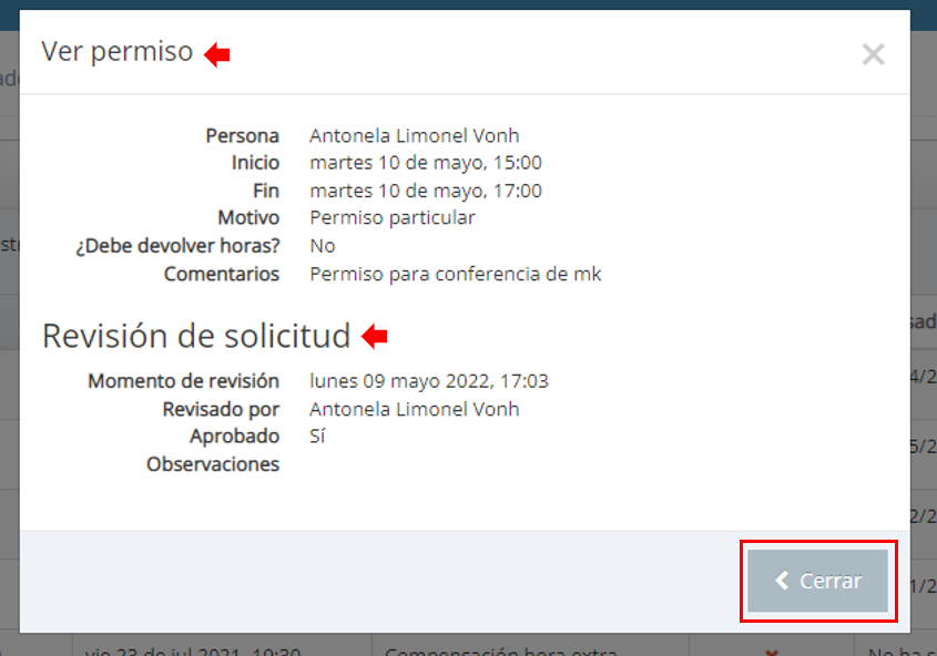 b. Le aparecerá la siguiente ventana modal, en la cual podrá visualizar todos los detalles del permiso.