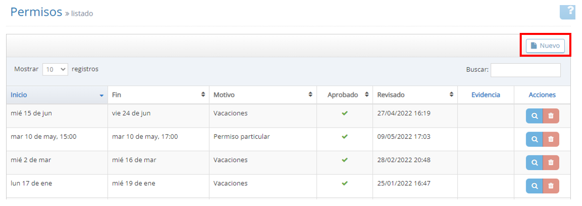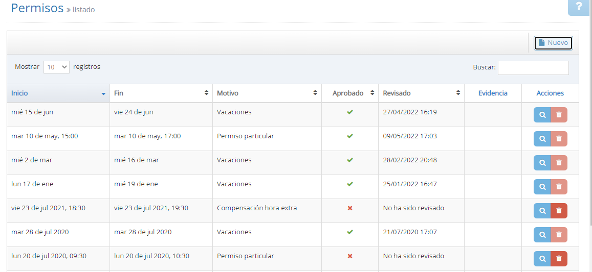 En la siguiente tabla se puede visualizar todos los permisos solicitados y el estado actual de los mismos, una vez su jefe inmediato apruebe o rechace un permiso, el sistema le enviará una notificación informando la respuesta de la solicitud.