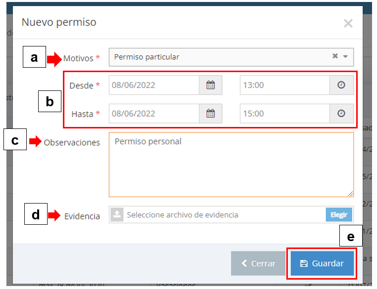 - Establecer la fecha y hora de inicio y fin del permiso.