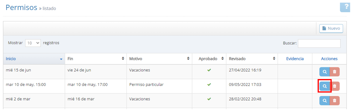 Para visualizar la información detallada del permiso o de la solicitud de permiso, debe realizar lo siguiente: