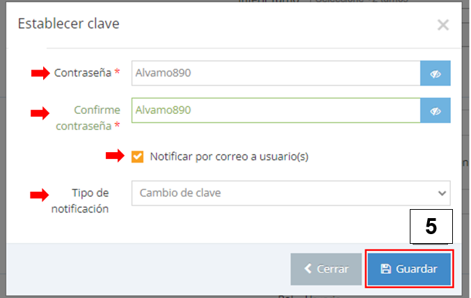 - Contraseña: la clave a establecer debe ser mínimo 6 dígitos, y debe contener números, una letra mayúscula y una minúscula.
