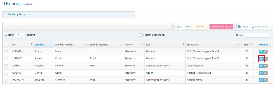 3. Le aparecerá la siguiente pantalla, seleccione el usuario y haga click en el botón "Editar usuario" que se encuentra en la columna de acciones.