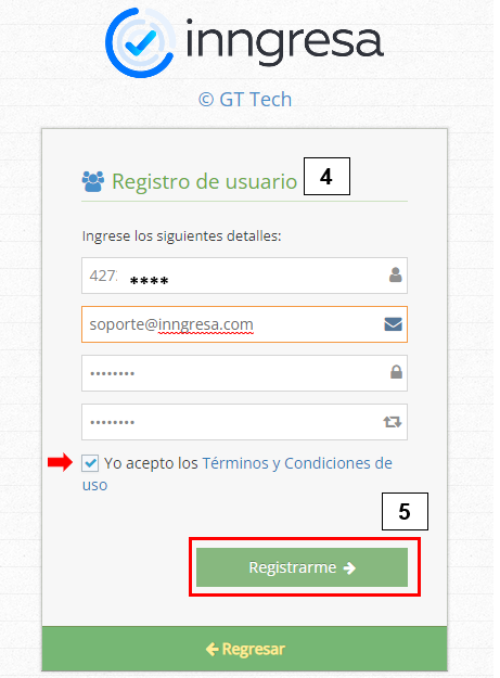 3. Rellene el formulario con la siguiente información: número de DNI o número de identificación, correo electrónico y clave. Habilite la opción "Yo acepto los Términos y Condiciones de uso".