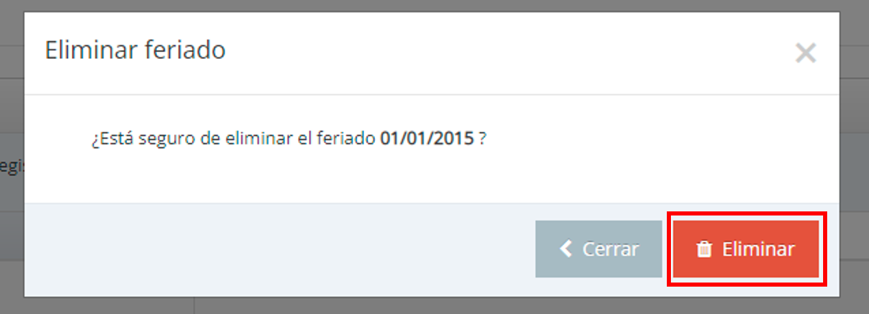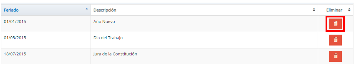 1. Seleccione el feriado a eliminar y haga click en el botón “Eliminar”.