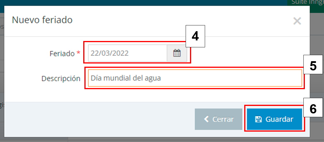 5. Agregar una descripción, posteriormente será utilizada como nombre del feriado. Se sugiere que sea corta y concisa.