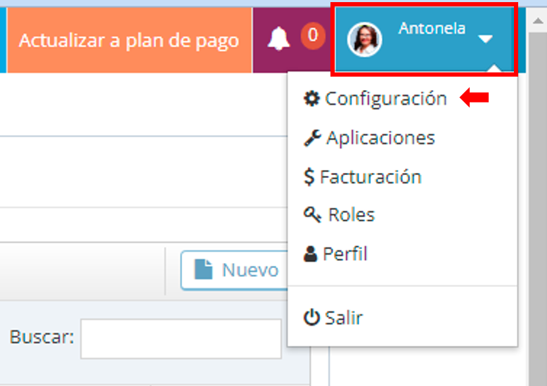 1. Para ingresar a la sección de "Configuración", haga click donde se encuentra su nombre de usuario en la barra superior y luego a "Configuración".
