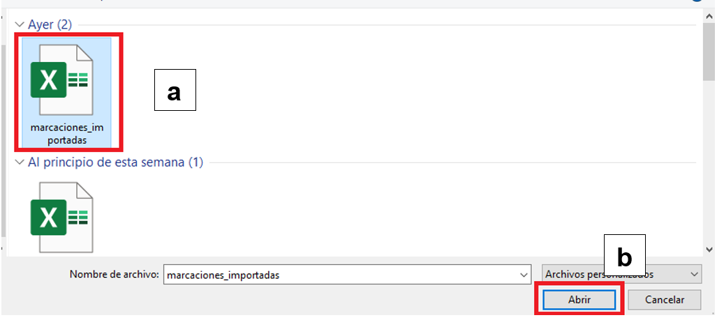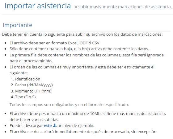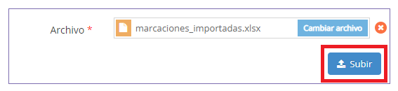 Es una alternativa que permite crear las marcaciones olvidadas de manera masiva, desde esta sección podrá importar las marcaciones validadas previamente por el administrador (supervisor) desde un archivo de Excel. Al momento de importar el archivo, se sugiere la revisión de los permisos excluyentes o marcas extempóraneas configuradas en los turnos pues de existir alguna limitación la marca será ignorada y considerada como errónea.
