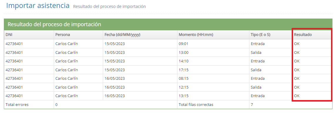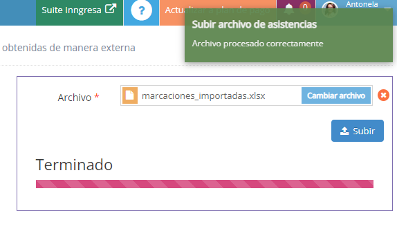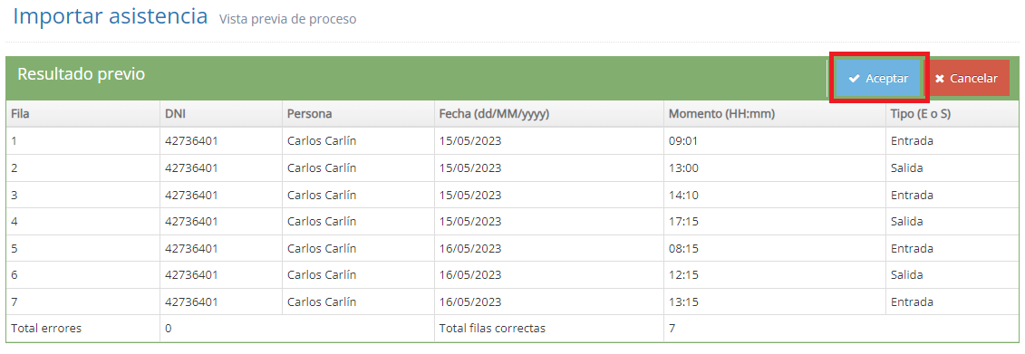 4. Si están las marcaciones de asistencia del archivo de Excel completas haga click en el botón "Aceptar" para completar la acción.
