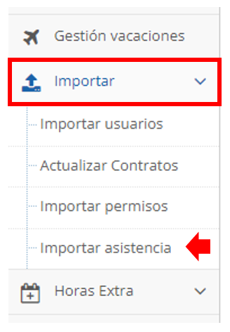 1. Ubicar el menú que se encuentra en el lado izquierdo, haga click a la opción "Importar" y luego a la opción "Importar asistencia".