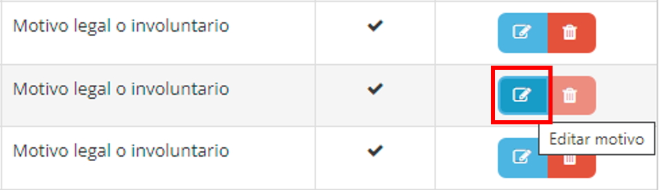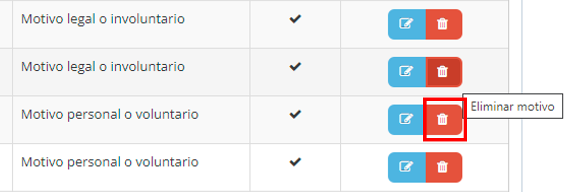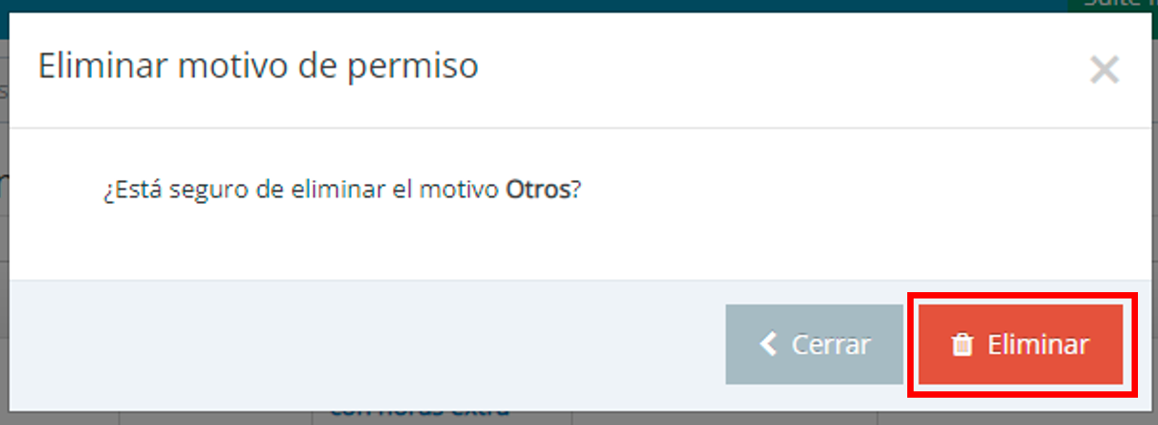 1. Seleccione el motivo de permiso que desea eliminar y luego haga click en el botón de “Eliminar”.