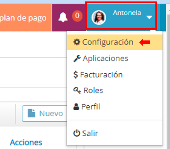 1. Para ingresar a la sección de "Configuración", haga click donde se encuentra su nombre de usuario en la barra superior y luego a "Configuración".