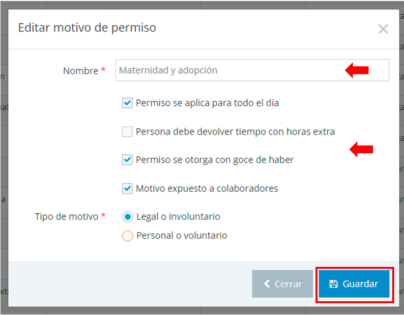 2. Actualice el nombre y/o las características del motivo de permiso seleccionado y luego haga click en el botón “Guardar”.