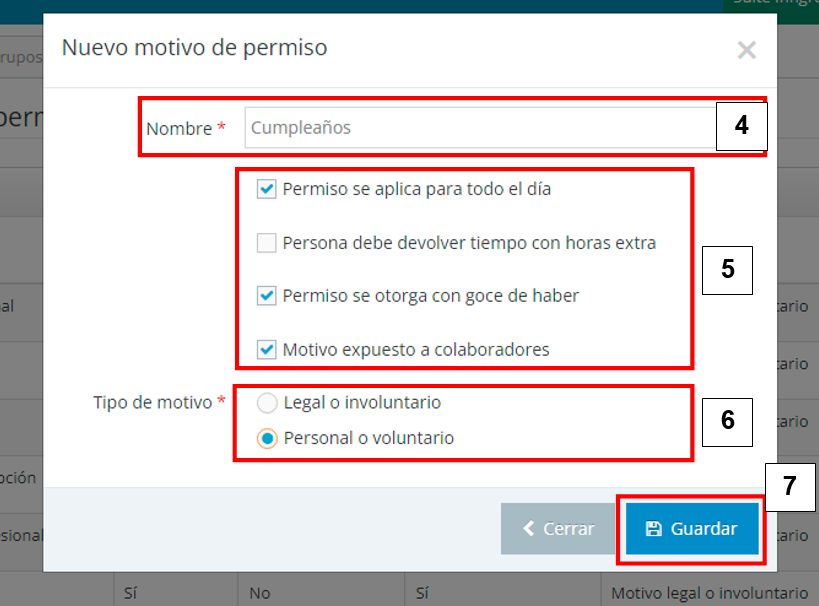 4. Defina un nombre para el motivo de permiso.