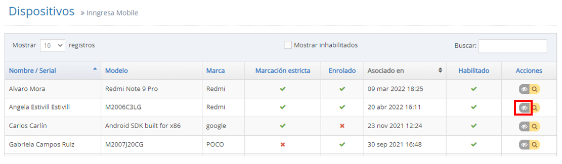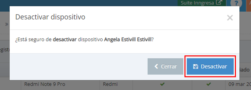 2. Seleccione al dispositivo y haga click en el botón "Desactivar dispositivo" que se encuentra en la columna de acciones.