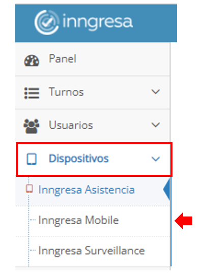 1. Ubicar el menú que se encuentra en el lado izquierdo, haga click a la opción "Dispositivos" y luego a "Inngresa Mobile".