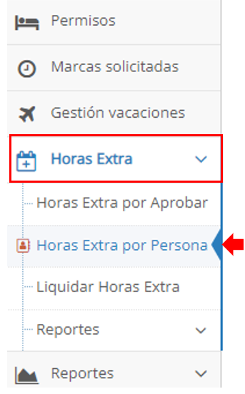1. Desde el menú lateral izquierdo, seleccione “Horas Extras” y luego “Horas extra por persona.”